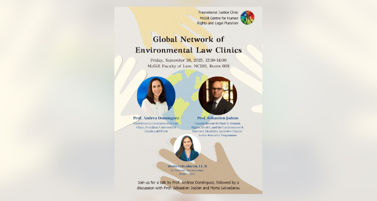 El pasado 26 de septiembre de 2025, la profesora Andrea Domínguez, docente de la Clínica Jurídica Ambiental de la Facultad de Derecho de la PUCP y coordinadora de la Alianza Latinoamericana y Caribeña de Clínicas Jurídicas Ambientales, participó como ponente invitada en el evento “Global Network of Environmental Law Clinics”, organizado por la Transnational Justice Clinic y el Centre for Human Rights and Legal Pluralism de la Universidad de McGill (Montreal, Canadá).